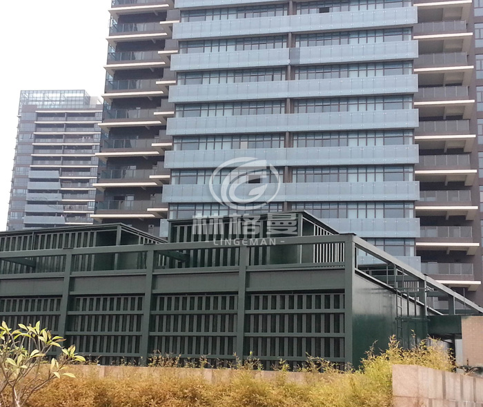 (2)罩體下部進風消聲系統(tǒng)主要包括:進氣消聲器、可拆卸檢修活動版、復合隔聲層、防雨百葉、檢修消聲通道及隔聲門等。為了防止下半部落水噪聲向低層居民住宅傳播。冷卻塔下半部分安裝具有隔聲、消聲、吸聲、通風散熱、設(shè)備檢修方便的進風消聲系統(tǒng)。罩體下部兩側(cè)均加裝進風消聲器,消聲器消聲片長度西側(cè)900mm,東側(cè)臨街部分消聲片長500mm,消聲片統(tǒng)一厚度 100mm以降低進風噪聲; 消聲量因消聲片長度而定。