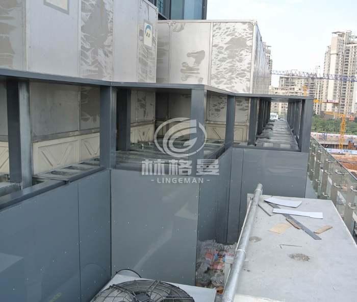 (1)為了防止上半部風扇噪聲向高層周邊傳播。冷卻塔需安裝具有隔聲、消聲、吸聲、通風散熱、設備檢修方便為一體的排風消聲系統。其上半部排風消聲系統主要包括:消聲靜壓箱、排氣消聲器、可拆卸檢修活動板等。