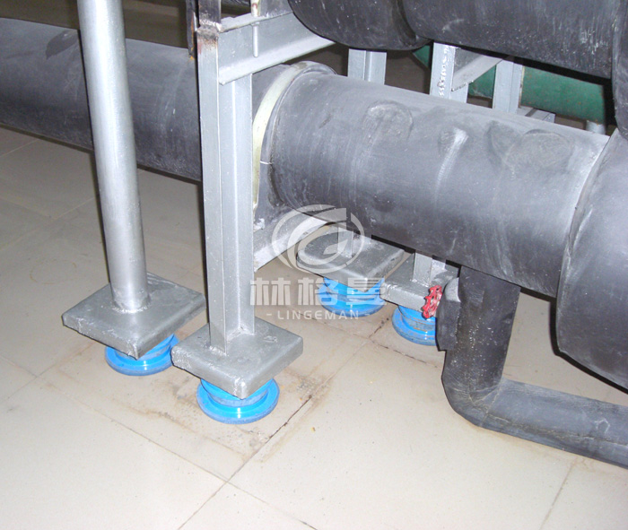 這樣可使空調主機運行時振動源在最近距離內給予減弱,降低傳給冷凍主管的振動,彎頭至空調主機段主管安裝彈簧減振器支承。